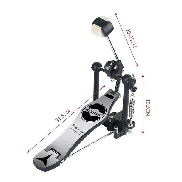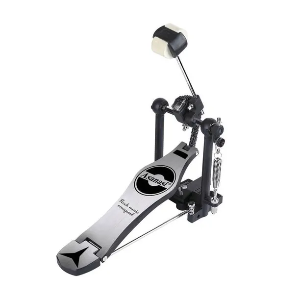 Solidnie wykonany pedał perkusyjny do bębna basowego z pojedynczym bijakiem na łańcuchu.