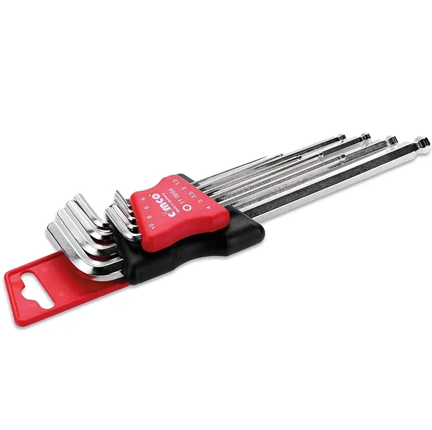 Zestaw kluczy imbusowych SPEZIAL, 9-częściowy, o rozmiarach kluczy SW 1,5 SW 2 SW 2,5 SW 3 SW 4 SW 5 SW 6 SW 8 SW 10 mm, bardzo długie ostrze z łbem kulistym, wykonane z hartowanej stali specjalnej S2, polerowana, chromowana na twardo powierzchnia, w praktycznym plastikowym uchwycie z klipsem do paska. Cecha szczególna: dzięki specjalnemu kształtowi klucza można poluzować nawet uszkodzone (zaokrąglone) śruby imbusowe (nie po stronie łba kulowego).