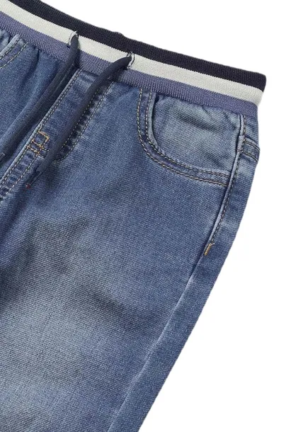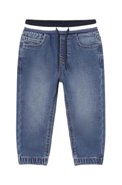 Jeansy dziecięce z kolekcji Mayoral. Model wykonany z ozdobnie przetartego denimu. Fason jogger. Średni stan z elastyczną listwą w pasie. Nogawki wykończone ściągaczem. Wsuwane kieszenie. Ozdobnie sprany denim.
