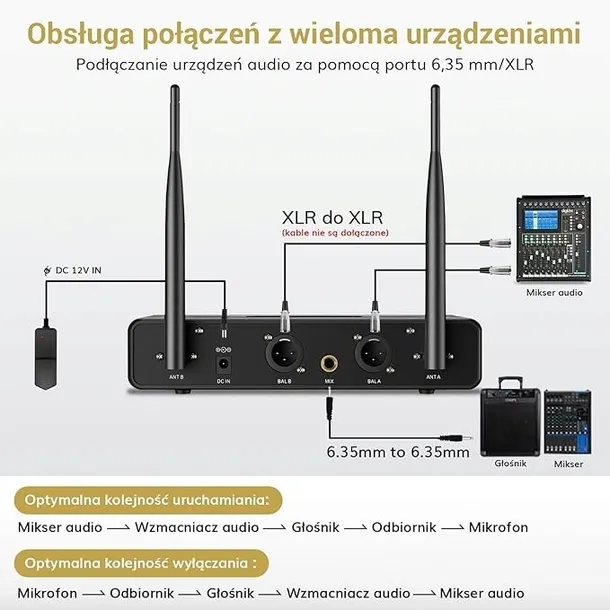 Wystarczy podłączyć odbiornik do urządzenia audio, włożyć po dwie baterie AA do każdego mikrofonu, a system automatycznie zsynchronizuje mikrofony z odbiornikiem. Obsługa nie wymaga specjalistycznej wiedzy technicznej.