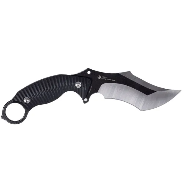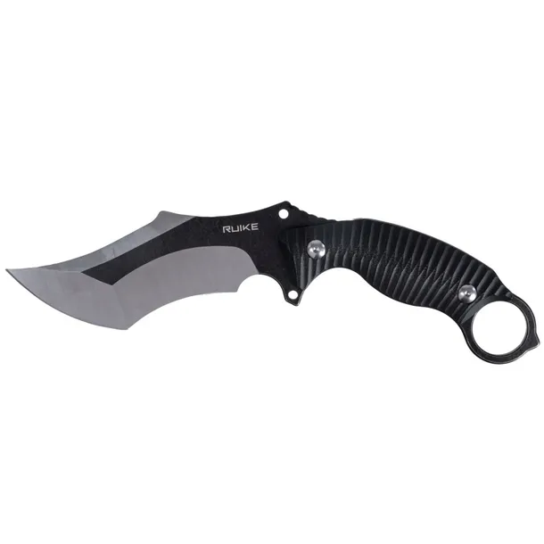 Ruike P181-B czarno-srebrny to nóż taktyczny typu karambit, wyposażony w stałą głownię ze stali nierdzewnej 14C28N, rękojeść z laminatu G10, charakterystyczny stalowy pierścień oraz polimerową pochewkę z klipsem 360°.