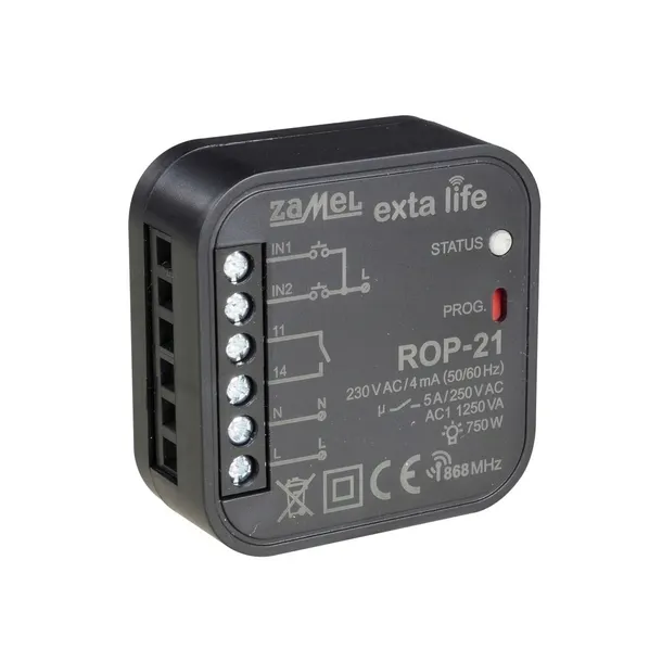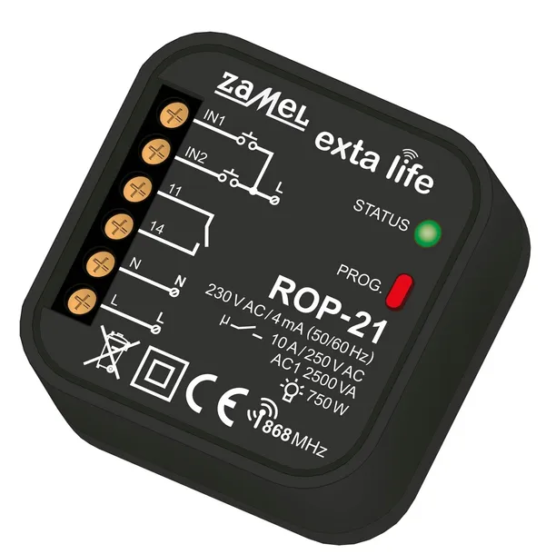 Radiowy odbiornik puszkowy ROP-21 to element końcowy systemu EXTA LIFE, który umożliwia sterowanie dowolnymi urządzeniami w domu lub biurze. Wyjście w postaci pojedynczego styku zwiernego daje możliwość sterowania obwodami niskonapięciowymi (na przykład 12/24 V AC/DC) oraz wysokonapięciowymi (230 V AC). ROP-21 sprawdza się także przy zdalnym wyzwalaniu innych urządzeń oraz przy podawaniu sygnałów sterujących. Odbiornik można także z powodzeniem wykorzystać do sterowania elektrozaworami w systemach ogrzewania. Aktualny stan urządzenia sterowanego poprzez ROP-21 wskazywany jest w aplikacji mobilnej dzięki komunikacji dwukierunkowej pomiędzy odbiornikiem a kontrolerem. Taki sposób komunikacji umożliwia także parametryzację odbiornika oraz zdalne dopisanie nadajników (bez fizycznego dostępu do odbiornika). Algorytm kodowania ramek zapewnia bezpieczeństwo sterowania. ROP-21 poza kontrolerem może być równolegle sterowany z poziomu nadajników systemu EXTA LIFE. Do odbiornika można wpisać większą liczbę nadajników co daje możliwość niezależnego sterowania z kilku miejsc. Urządzenie przeznaczone jest do montażu w puszkach instalacyjnych pod- i natynkowych. Dodatkowe, konfigurowalne wejścia przewodowe zwiększają funkcjonalność sterowania. Odbiornik posiada zaimplementowaną funkcję zdalnej aktualizacji oprogramowania z poziomu kontrolera.